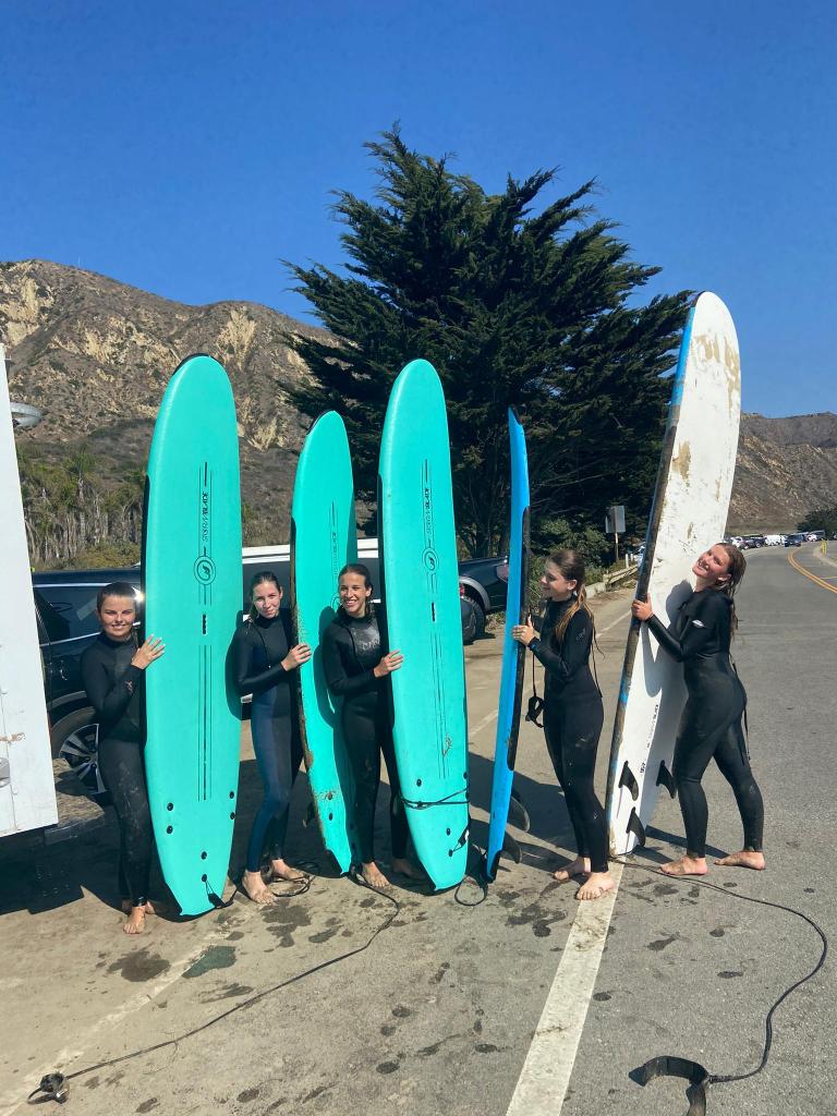 This was our first time surfing in Santa Barbara. We searched on the Internet for a surfing school because we wanted to do that with some friends. We took a Lyft to Mondos beach. A truck was near the beach with all the stuff we needed for surfing. After we put on the wetsuits, we went down to the beach and the teacher explained to us how to stand up. Then we went into the water. First, it was a little bit complicated to stand up, but then we got used to it and the teacher always helped us. It was amazing and fun. We enjoyed our surfing lesson.